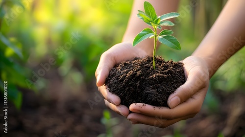 A close-up of a person holding a small plant with soil in their hands, with a blurred background of a thriving community garden, symbolizing sustainable living, eco-conscious choices, and environmenta