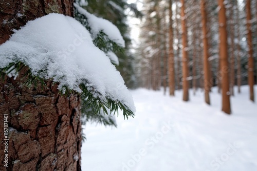 A close-up of a pine tree adorned with a soft layer of snow, showcasing the natural beauty of winter and the calmness that snow brings to the forest environment.