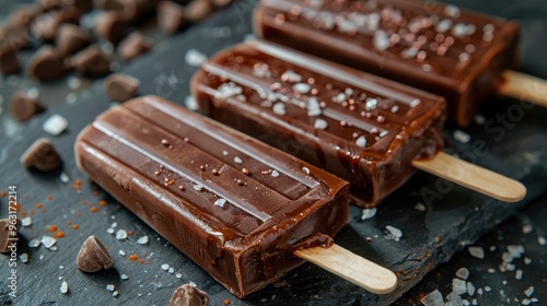 A close-up of a popsicle with a layer of dark chocolate and sea salt, displayed on a slate board. The contrast of the rich chocolate and the vibrant popsicle colors creates a mouth-watering effect.