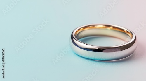 A close-up of a shiny wedding ring featuring a polished surface and a gold inner band, set against a soft blue background.