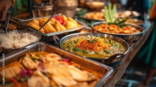 A close-up of a table filled with Thai and Indian favorites, including green curry, samosas, and mango sticky rice, ready to be enjoyed.