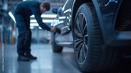 A close-up of a technician balancing a carâs new summer tire, ensuring a smooth ride after replacing the winter tire. The clean, well-lit garage setting provides a professional bac