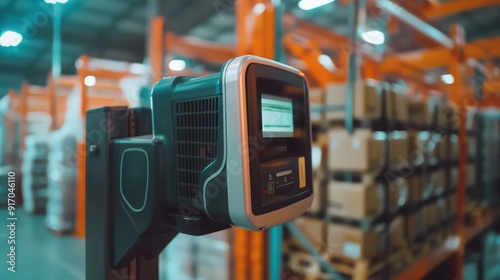 A close-up of a warehouse barcode scanning system being used for inventory tracking and management.