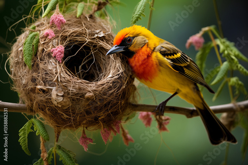 A close-up of a weaver bird building its nest