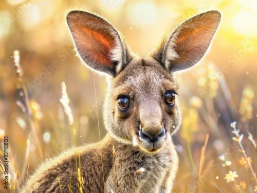 A close-up of a young kangaroo in a sunlit field, showcasing its large ears and curious expression amidst soft, blurred foliage.