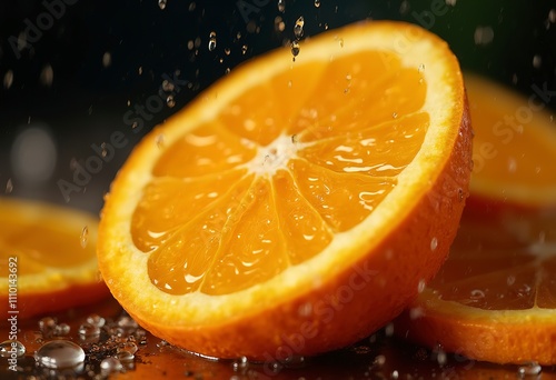 A close-up of an orange slice with water droplets and bubbles on the surface, creating a vibrant and textured image