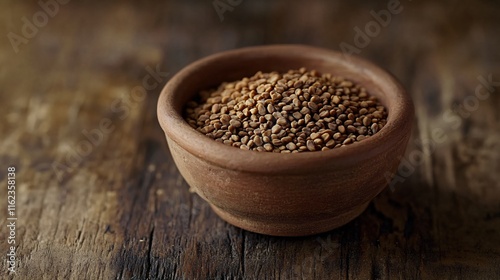 A close-up of fenugreek seeds in a handmade clay dish, placed on a wooden table with earthy tones