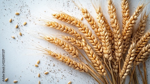 A close-up of golden wheat stalks arranged artistically on a surface.