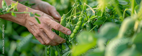 A close-up of hands picking fresh peas from a vine, with more green pea pods visible in the background.