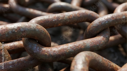 A close-up of large, interlocked iron chains heavily corroded by rust, revealing a rough texture and symbolizing strength weathered by time.