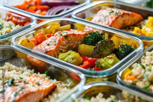 A close-up of meal prep containers filled with roasted vegetables, brown rice, and grilled salmon