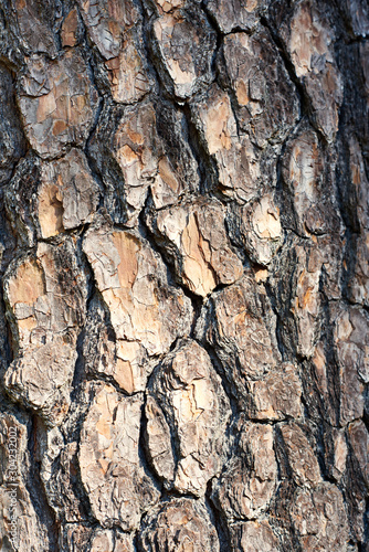 A closeup of the bark on the trunk of a pine tree.