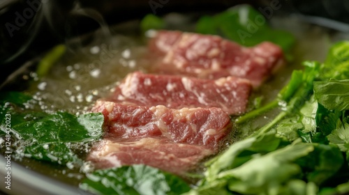 A close-up of thinly sliced wagyu beef being dipped into bubbling shabu broth with vibrant greens in the background.