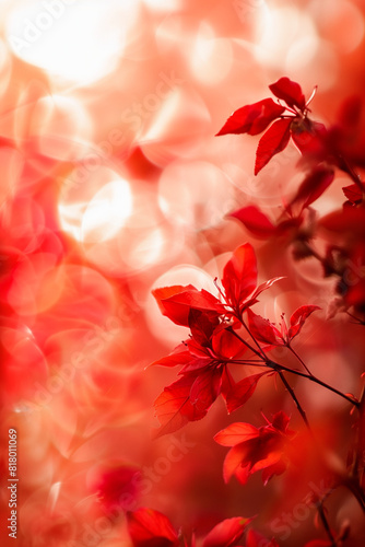 A close-up of vibrant red leaves against a soft, bokeh background, creating a warm and dreamy atmosphere with delicate, glowing light.