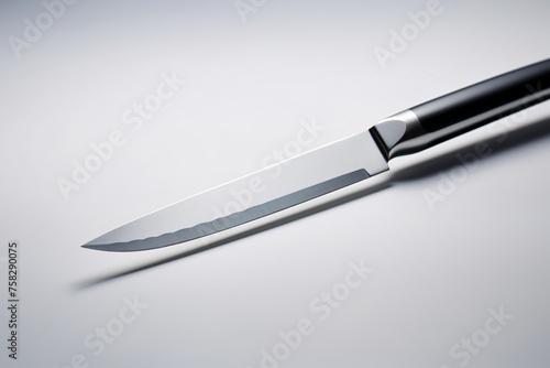 A close-up perspective of a gleaming stainless steel kitchen knife, its sharp blade catching the light, against a gray background