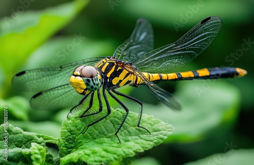A close-up photo of a dragonfly with black and yellow stripes, resting on green leaves in the garden