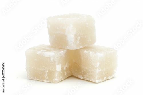 A close-up photograph depicts a pyramid made of three white sugar cubes placed on a white surface, set against an isolated white background.