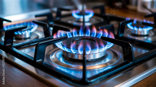 A close-up photograph of a gas stovetop with multiple burners, focusing on one lit burner in the center.