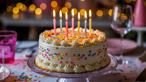 A close-up photograph of a round birthday cake on a clear glass cake stand