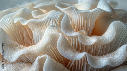 A close-up photograph showcasing the intricate folds and delicate textures of a beautiful, exotic, and unique mushroom, displaying nature's artistry in the form of elegant, wavy gills and soft hues