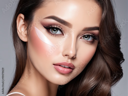 A close-up portrait of a woman showcasing makeup artistry with highlighted features and glossy lips.