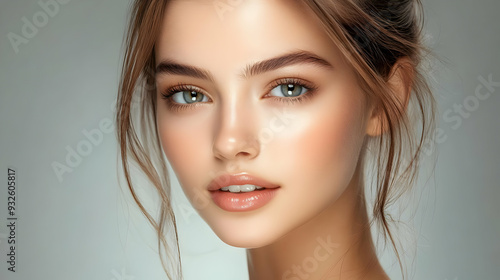 A close-up portrait of a young woman with natural makeup.