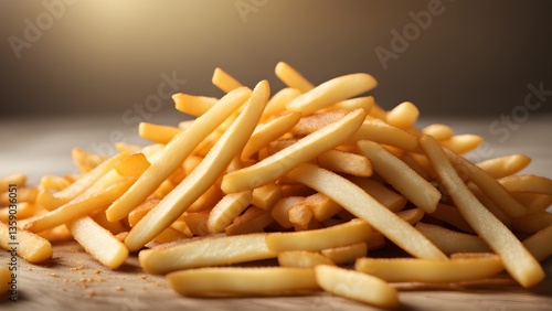 A close-up shot a delicious pile golden-brown french fries a wooden surface.