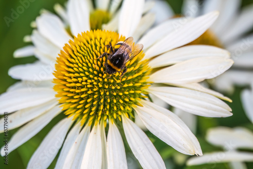 A closeup shot of a bee collecting pollen on a white echinacea flower