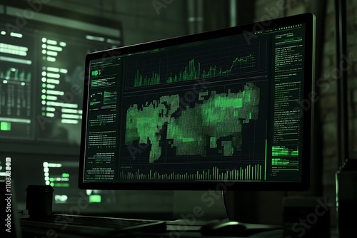A close-up shot of a computer monitor displaying a world map with data, code and charts, creating a dark and futuristic ambiance.