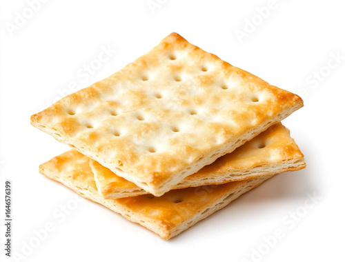 A close-up shot of a small pile of square creme crackers stacked against a plain white background. The crackers are golden-brown with small holes on their surface.