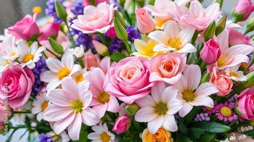 A close-up shot of a vibrant bouquet of assorted flowers in full bloom, garden, daisies