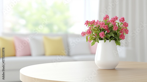 A close-up shot of a white vase filled with vibrant pink flowers on a wooden table, with blurred out details of pillows and a sofa in the background, creating a cozy and welcoming atmosphere