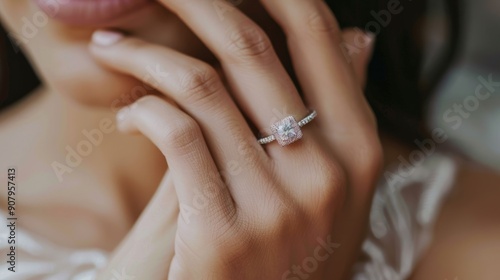 A close-up shot of a woman wearing a diamond wedding ring on her hand. Marriage and vows concept topics.
