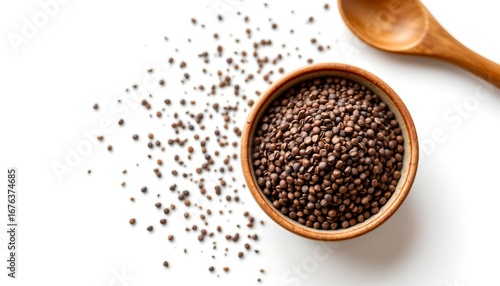 A close-up shot of brown lentils in a wooden bowl with a wooden spoon. The lentils are scattered on a surface and the bowl appears to be placed off-center