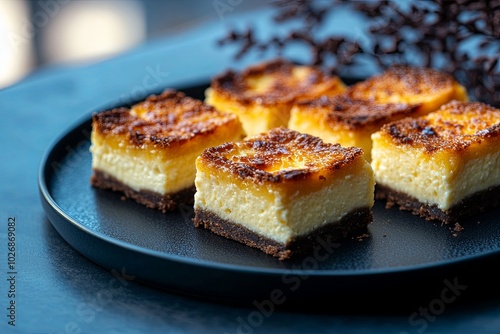 A close-up shot of five delicious, freshly baked cheesecake bars on a black plate.