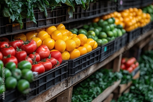 A close-up shot of fresh produce displayed in a market stall with bright red tomatoes, yellow oranges, green limes, and leafy greens arranged neatly in black crates on wooden shelves.