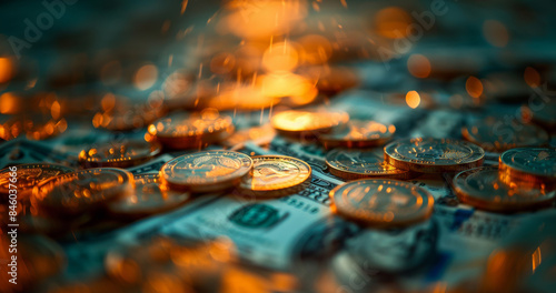 A close-up shot of gold coins scattered on dollar bills, illuminated by warm, orange light. The image highlights the detail of the coins and the textured surface of the bills.