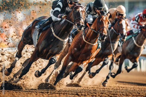 A close-up shot of thoroughbred horses racing down a dirt track, kicking up dust and vying for the lead.