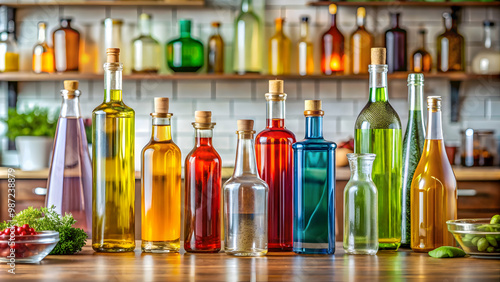 A close-up shot of various sized and colored bottles commonly used in a kitchen setting, kitchen, containers, storage, organization