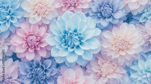 A close-up shot showcasing the delicate beauty of pastel blue, pink, and purple dahlias, capturing their intricate petals and soft color palette. These flowers symbolize love, gratitude, and new begi