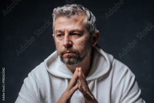 A close-up studio portrait of a mature man with salt-and-pepper hair and a serious, thoughtful expression. Wearing a white hoodie, he poses with hands clasped in front of him