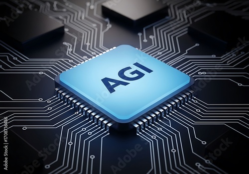 A close-up view of a blue AGI microchip on a dark circuit board, symbolizing advanced artificial general intelligence technology and future computing.