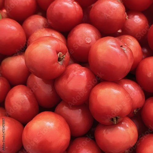 A close-up view of a group of ripe, vivid Acerola with a deep, textured detail.