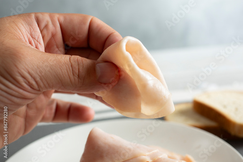 A closeup view of a hand holding a folded piece of processed turkey deli meat slices.
