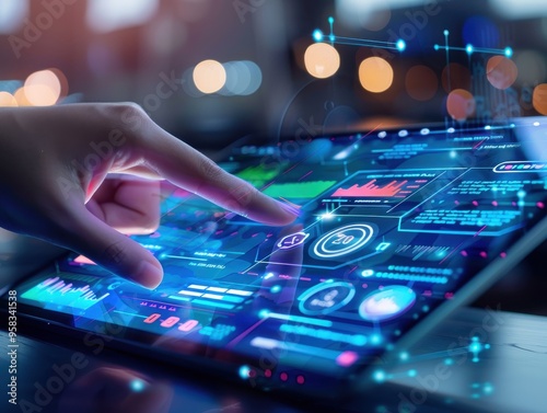 A close-up view of a hand interacting with a futuristic digital tablet interface displaying graphs and data analysis.