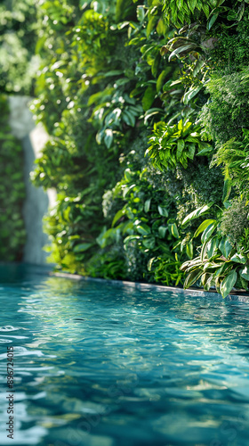 A close-up view of a sparkling blue swimming pool with a vibrant green wall of plants in the background