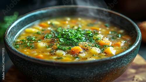 A close-up view of a steaming hot bowl of homemade vegetable soup,filled with a variety of colorful and nutritious ingredients like root vegetables,leafy greens,and aromatic herbs.
