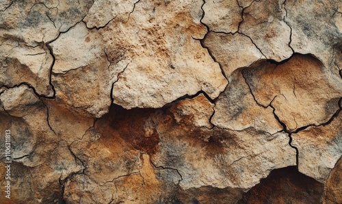 A close-up view of a textured stone wall, showcasing the natural cracks and rugged surface of the uneven, earthy-colored rocks