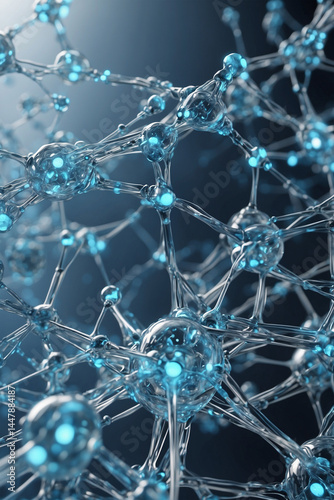 A close-up view of blue molecules in a scientific and futuristic style. A visually striking representation of chemistry, science, and molecular structures