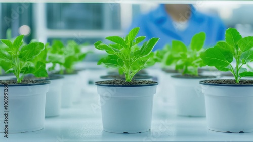 A close-up view of green seedlings growing in white pots, emphasizing plant cultivation in a controlled environment.